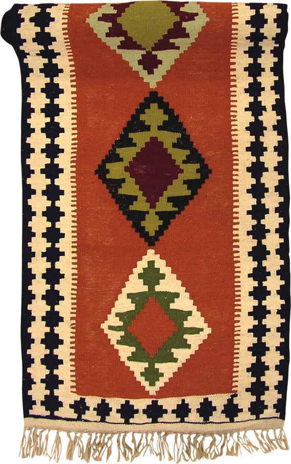 ベージュ・茶色が黒色との組み合わせによりアクセントの効いたメリハリのある色使いとして表現されています。いびつな仕上がりも、整然とした機械的な直線では無い丸みと感じられます。商品やデザインに歪みがございますが、一般的にキリム全般に多少の歪みがあるのが通常です。遊牧民の味わいと感じていただけると有り難いです。ウール素材なので丈夫で長持ち、廊下敷きに最適です。 |