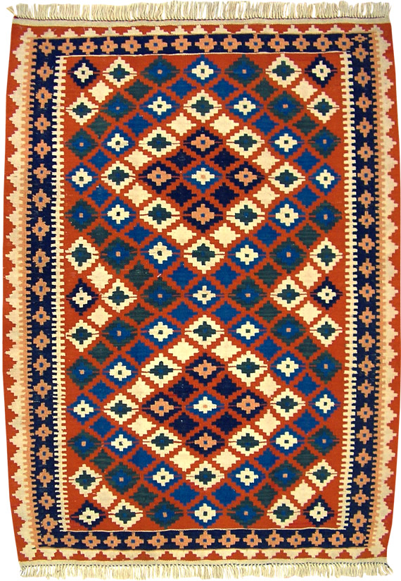 茶色とベージュはキリムの代表的な色柄で、温かみがあります。ボーダーとセンターに使われている紺色との相性も良いです。菱形を組み合わせたデザインが、斜め方向への広がりを感じさせます。商品やデザインに歪みがございますが、この商品に限ったことでは無く一般的にキリム全般に多少の歪みがあるのが通常です。遊牧民の味わいと感じていただけると有り難いです。ウール素材なので丈夫で長持ち、玄関マットやプライベートルームに最適なサイズです。 |
