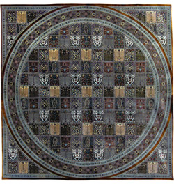 厳選素材と最高技術によってのみ生み出される至高の逸品です。金茶色と深い緑色が放つその輝きは、描かれている文様と相まって極楽浄土を感じさせます。図柄はペルシャでは有名な千夜一夜を描いたヘシティーですが、四角形の中に円形を描いている、デザイン的にも美しく凝ったものとなっております。シルク素材なので美しく艶がありますが、傷みやすいので重い家具の下には不向きです。和室や仏壇前などに特におすすめしたい作品です。 |