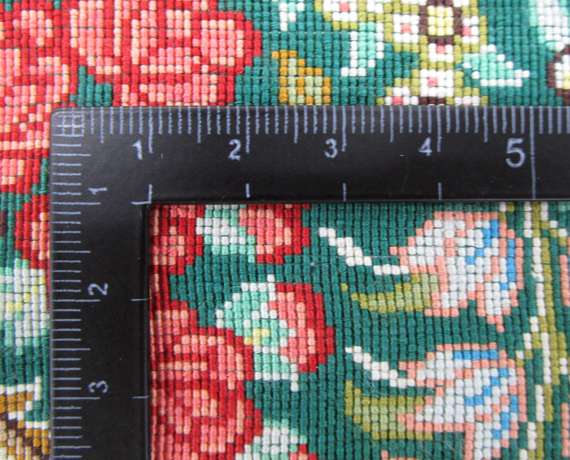 コム産/メダリオン柄/シルク/ハジュホセイニ工房。厳選されたシルク素材で、フィールドのベースは濃いグリーン、ボーダーは薄いグリーンを使用し、赤、ピンク、ブルー、白などの多彩な細かい花模様をフィールド全体に散りばめ優雅に表現しています。一見派手に感じる文様が、落ち着いた深みのある温かいバランスのとれた作品となっています。一平米当たり130万ノットを超える高品質に仕上げられています。 玄関、足元、ベッドサイドなどに最適です。 |