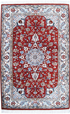 フィールド部の鮮やかな赤色とコーナー&ボーダー部の落ち着いたベージュ色のコントラストが絶妙です。図柄はメダリオンに分類されますが、デザイン細部が丁寧に描かれており素材の良さを引き出しています。シルク素材なので美しく艶がありますが、傷みやすいので重い家具の下には不向きです。玄関マットやプライベートルームに最適なサイズです。 |