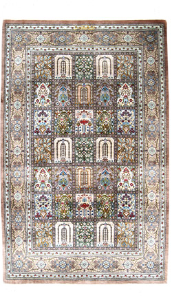 このデザインの第一人者と呼ばれるババイ制作では金茶色が特徴的ですが、この作品ではパステル系のベージュ色がベースとなっています。シルク本来の色艶が放つ包み込むような光沢は、和みと優しさと極楽浄土を感じさせます。図柄はペルシャでは有名な千夜一夜を描いたヘシティーです。シルク素材なので美しく艶がありますが、傷みやすいので重い家具の下には不向きです。仏壇前などに特におすすめしたい作品です。 |